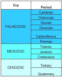 | · 寒武紀 (Cambrian) --------- 取名於拉丁文Cambria,即威爾斯。 · 奧陶紀 (Ordovician) ------- 名稱來自大不列顛的古老部落 (奧陶部落)。 · 志留紀 (Silurian) ----------- 名稱來自大不列顛的古老部落 (志留部落)。 · 泥盤紀 (Devonian) --------- 名稱來自英國德文郡 (Devonshire)。 · 石炭紀 (Carboniferous) --- 名稱自來大不列顛群島的含煤的岩石。 · 二疊紀 (Permian) ----------- 取名於俄羅斯的彼爾武省(Perm)。 · 三疊紀 (Triassic) ----------- 來自拉丁文 "三" (Trias)。 · 侏羅紀 (Jurassic) ----------- 取名於法國與瑞士之間的汝拉山 (Jura Mountain)。 · 白堊紀 (Cretaceous) ------- 取自拉丁文 Creta,意指白堊。 · 第三紀 (Tertiary) ----------- 第三個衍生物。 · 第四紀 (Quaternary) ------- 第四個衍生物。 · 資料來源:維基百科。 搜尋關鍵字:地質時代表。 |