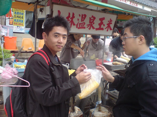肚子餓,受不了烤玉米的香味誘惑,盧老爹最後還是買了一支甜玉米。
